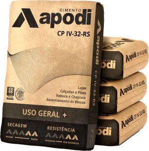 O Cimento Apodi CP IV-32 RS combina versatilidade e desempenho superior em diferentes aplicações. Produzido com adições minerais, garante alta durabilidade, menor calor de hidratação e resistência a ambientes agressivos. É a escolha certa para estruturas robustas, argamassas de assentamento e revestimento, contrapisos e artefatos de concreto.